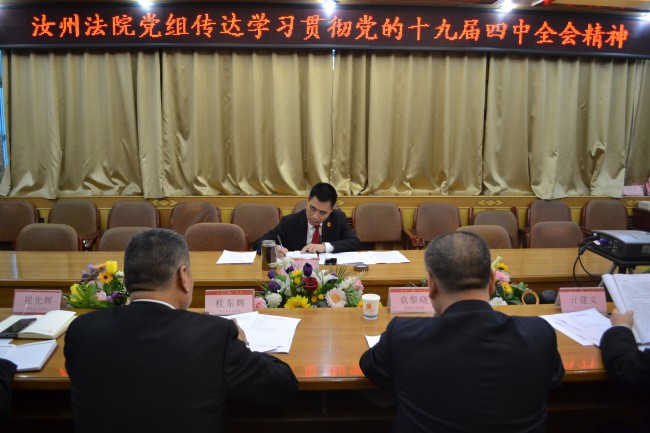 2019年11月4日上午,汝州市人民法院在二楼会议室召开党组会,传达学习习近平总书记在党的十九届四中全会上的重要讲话精神和全会精神。会议由院党组书记、院长杨长坡主持,全体班子成员参加会议。