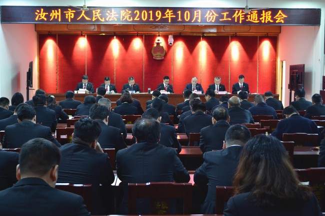 2019年11月11日下午,汝州市人民法院在一号审判庭召开2019年10月份工作通报会,会议对1至10月份工作进行全面总结,分析研判各项考核指标,安排部署下一步重点工作,会议由党组书记、院长杨长坡主持,全体干警参加会议。