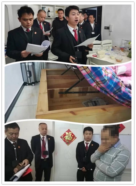 第一行动小组在党组副书记、常务副院长袁黎晓的带领下,首先来到瓷都文华苑被执行人吕某家,尚某某申请执行吕某某租赁合同纠纷一案,当尚在睡梦中的吕某一家人被执行干警敲门声惊醒后,被执行人妻子隔门告诉执行法官说吕某不在家中,磨蹭半天才开门。开门后依然口口声声称和被执行人已经离婚了,房产也是她了。执行干警果断出示搜查证,执行人员迅速进房中仔细查找,各个房间都查找没有,唯独被执行人儿女睡的房间没有搜查,带队的袁黎晓副院长进行搜查,突然发现床铺下好像有人,于是掀开床板,被执行人吕某果然藏在其中。被发现的吕某只好爬了出来说:“算了,今天我认栽了!”其女儿也天真地说道:“爸爸你怎么没有藏好,还被警察叔叔发现了”经查,被执行人用的是价值5000多元的苹果手机,当即执行法官对其采取强制措施,随后,袁黎晓副院长带领执行一组干警又来到城垣路某宾馆、骑庄居委会某小区、王寨乡冶墙村、夏店乡孔寨村、庙下镇郭庄村查找和拘留涉案被执行人,并对相关被执行人财物予以查封。