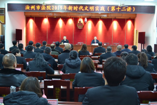 2019年12月10日上午,汝州市人民法院举办2019年新时代文明实践所第十二讲,党组副书记、常务副院长袁黎晓带领全体干警学习《中共中央关于坚持和完善中国特色社会主义制度 推进国家治理体系和治理能力现代化若干重大问题的决定》。