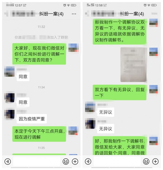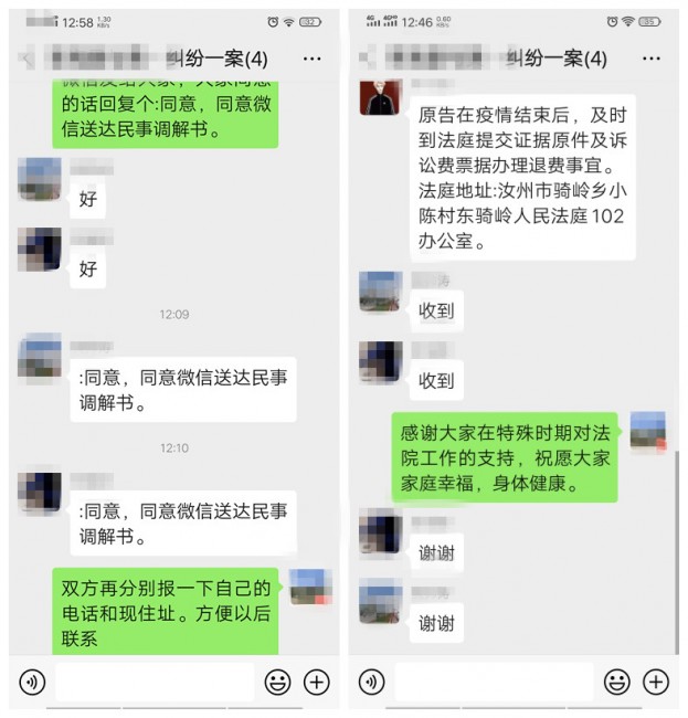 疫情防控要求大家尽量少出门,但当事人的案件已经定了开庭时间,眼看临期,这可急坏了办案法官。周一一大早,承办法官于延坡和其团队书记员在骑岭人民法庭庭长常伊晓的带领下来到了法庭,经汇报案情,并征询当事人意见后,常庭长指示该案可以运用网上开庭。于延坡法官考虑到从方便当事人出发,现在微信运用比较广泛,决定运用微信进行调解办案。在征得原被告双方当事人的同意后,于延坡法官和书记员与原被告组建了该案的一个微信群,经过核实当事人身份、出示证据、交换调解意见等程序,最终在本院主持下达成了一致的调解协议。鉴于特殊形势,双方当事人对调解协议无异议后均同意微信送达裁判文书,承办人员当即制作出调解书向原被告微信送达了调解书。