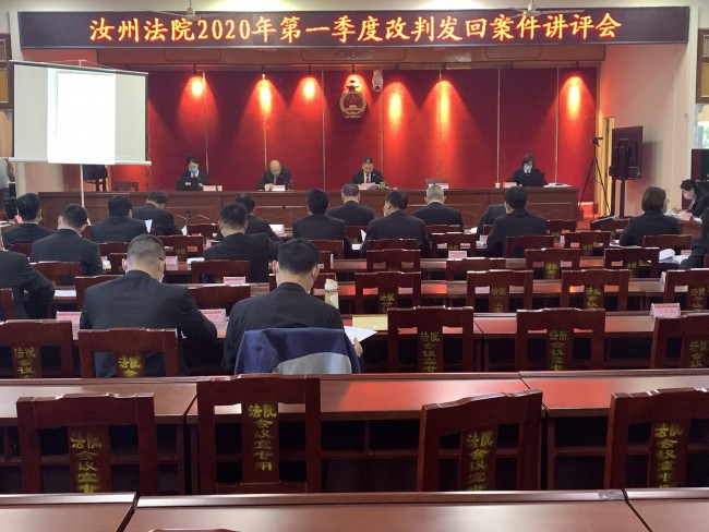 根据《汝州市法院改判和发回重审案件讲评制度》,2020年4月24日下午,汝州市法院在该院一号审判庭召开第一季度改判发回重审案件讲评会,该院在家班子成员、审委会委员、各部门负责人、纪检监察人员、员额法官及上会参评的案件审判组织成员参加会议。汝州市人大常委会办公室副主任刘春平、人大常委会委员程素梅、人大代表漫亚强,政协委员、神鹰律师事务所主任李向阳、汝州市法学会秘书长闫光杰应邀出席会议。会议由党组副书记、常务副院长袁黎晓主持。